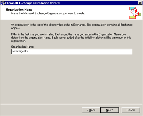 Successivamente, sarà necessario inserire il nome dell'organizzazione. questo è il nome dell'organizzazione tutti i server Exchange sul tuo dominio utilizzeranno.