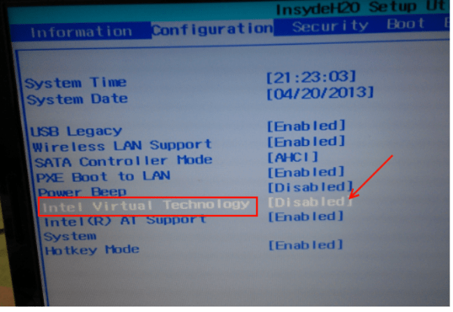 Se si utilizza un processore Intel nel computer, potrebbe essere necessario abilitare la virtualizzazione hardware VT-x nel BIOS. per consentire che, riavviare il computer e andare alle impostazioni del BIOS, e andare a configurazione o di sicurezza e abilitare Intel Technology virtuale: